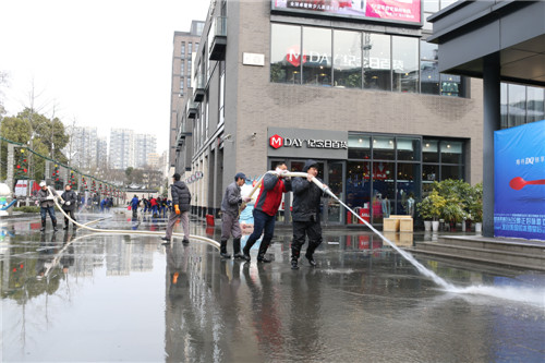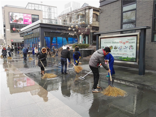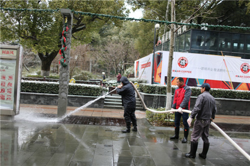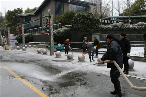 23日的凌晨整個(gè)湖州城積雪加上冰凍,仿佛進(jìn)入了“慢鏡頭”模式,緩緩地開車,小心翼翼地行走。愛山廣場(chǎng)步行街區(qū)也被這白茫茫的一片籠罩著,雖然只是薄薄的一層,可耐不住冰凍呀!看到這樣的情況,物業(yè)服務(wù)中心的領(lǐng)導(dǎo)和員工們第一時(shí)間行動(dòng)起來打響了道路暢通“保衛(wèi)戰(zhàn)”。在潘文哲、邢燕的帶領(lǐng)指揮下我們分成了3個(gè)組,把愛山廣場(chǎng)步行街內(nèi)主干道路段:人民路、紅線范圍內(nèi)公園路,志成路(北起20#車庫口南至紅旗路口),同岑路(東起人民路口西至星火7#樓北側(cè))進(jìn)行包干。一大早,大伙兒就在各自的“包干區(qū)”里忙活起來。除雪、鏟冰、使用高壓水槍沖刷地面是個(gè)體力活,所以盡管室外白雪皚皚、寒風(fēng)刺骨,可是不少員工們的額頭上還是冒出了汗珠,直到早上十點(diǎn)鐘多,終于把三條主干道的積雪及薄冰鏟除干凈,大伙懸著的心放下了。